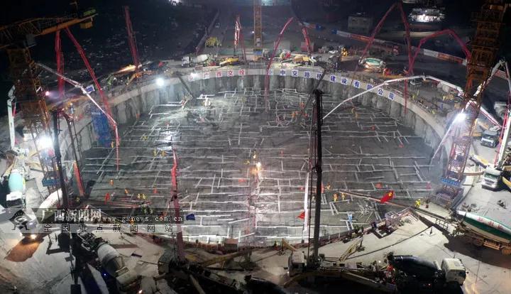 龍門大橋西錨碇位于廣西欽州龍門港鎮(zhèn)茅尾海淺灘上,由中交路橋建設(shè)有限公司承建,采用筑島圍堰形成陸域施工環(huán)境的方式進行作業(yè),在橋梁建設(shè)史上首次運用“大直徑樁+二期槽”的圓—矩咬合樁支護結(jié)構(gòu),形成一個方便基礎(chǔ)施工的直徑90米的圓形圍堰。自12月13日開盤澆筑以來,龍門大橋西錨碇填芯澆筑總計投入4個溜槽、9條生產(chǎn)線、12臺天泵、22個專項小組、128臺運料罐車、300名建設(shè)者,經(jīng)過連續(xù)24小時人不卸甲、機不停轉(zhuǎn)地施工作業(yè),最終僅用時86小時,鋼筋總用量達到480噸,澆筑面積約6358.5平方米,高效優(yōu)質(zhì)地完成5.86萬方混凝土的一次性連續(xù)澆筑。