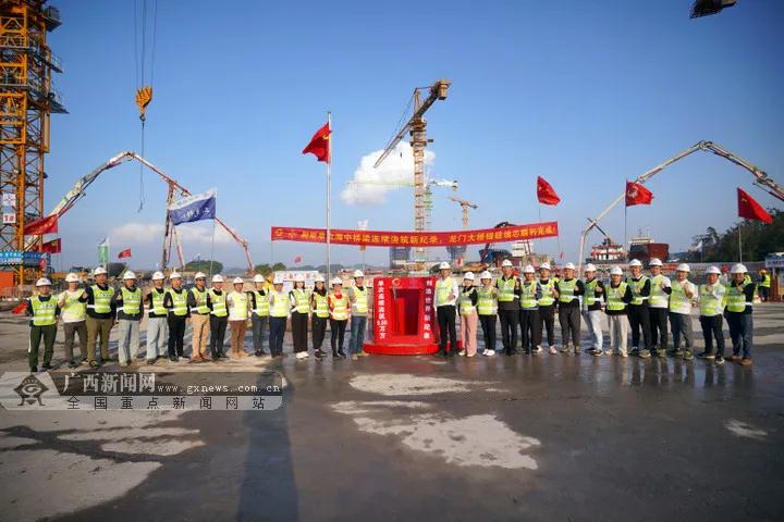 12月16日下午,經(jīng)過86小時的連續(xù)澆筑,由廣西交通投資集團投資建設(shè)的“廣西第一跨海大橋”龍門大橋西岸錨碇填芯混凝土澆筑工作順利完成。本次龍門大橋西錨碇填芯一次性連續(xù)澆筑方量達5.86萬方,成功打破該橋東錨碇在11月28日創(chuàng)下的4.7萬方的澆筑紀錄,再次刷新海中橋梁單次最大連續(xù)澆筑方量的世界紀錄。