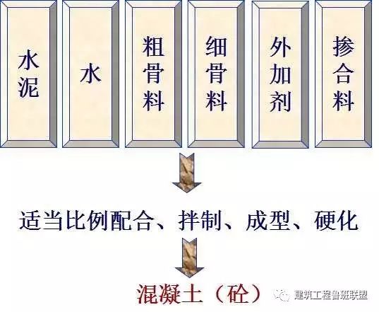 混凝土一般是由水泥、砂、石和水所組成,為改善混凝土的某些性能,還常加入適量的外加劑和摻合料。因此,混凝土主要由六大組分組成:①水泥、②水、③粗骨料(主要為石子)、④細(xì)骨料(主要為砂子)、⑤礦物摻合料(主要為粉煤灰或其他摻合料)、⑥外加劑(如膨脹劑、減水劑、緩凝劑等)。