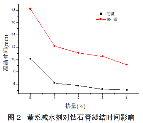 為了研究減水劑對(duì)鈦石膏性能的影響,選取萘系、聚羧酸類兩種常用的石膏減水劑,每種減水劑的摻量分別為石膏樣品重量的 1%、2%、3%、4%,測(cè)定減水劑種類及摻量對(duì)脫硫建筑石膏凝結(jié)時(shí)間、力學(xué)性能的影響,從而確定最佳的減水劑種類和用量。