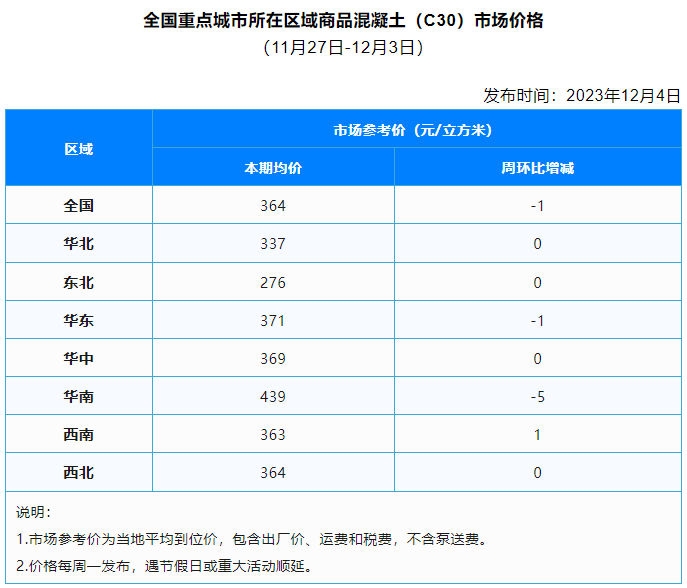 11月第5周,全國商品混凝土均價(jià)364元/立方米,較前一周下跌1元/立方米。整體來看,本周協(xié)會重點(diǎn)關(guān)注的36個(gè)城市中,6個(gè)城市商品混凝土均價(jià)下跌,其中三亞、青島和深圳商品混凝土均價(jià)跌幅較大;3個(gè)城市商品混凝土均價(jià)上漲,其中昆明商品混凝土均價(jià)上漲幅度較大;27個(gè)城市商品混凝土均價(jià)與上周一致。