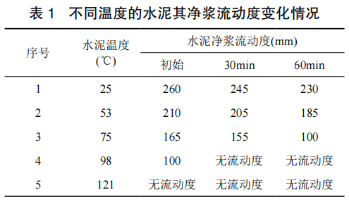 夏季外界環(huán)境溫度高,使得水泥降溫速率減慢,水泥出廠溫度往往高于冬季,運輸過程中不能降溫,運送到混凝土公司的水泥溫度偏高,有的甚至超過 80℃,造成水泥自身水化速度比較快。表 1 采用不同溫度的水泥進行凈漿試驗,發(fā)現(xiàn)水泥溫度越高,初始、經(jīng)時流動度均變小,且溫度越高影響越大。此外,水泥在粉磨過程中,磨機溫度升高使得部分二水石膏脫水變成半水石膏,由于兩者溶解速率的差異,造成不能有效控制水泥中 C3A 的水化,難以控制混凝土拌合物的坍落度損失。外加劑中的糖類緩凝劑和木質(zhì)素容易對硬石膏的溶解度產(chǎn)生影響,使用硬石膏作水泥緩凝劑時應(yīng)避免使用含有糖類物質(zhì)的外加劑。