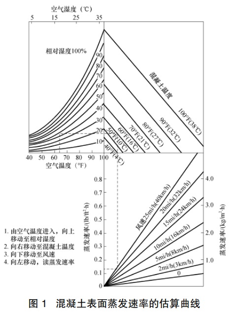 夏季氣溫高,再加上風(fēng)的作用,水份蒸發(fā)快,對此李家正翻譯的《混凝土技術(shù)》中進行了形象描述(如圖 1),保濕養(yǎng)護是控制混凝土拌合物失水造成塑性收縮裂縫的有效措施?;炷翝仓v實后,適當(dāng)?shù)臏囟扰c濕度是保證水泥水化的重要條件,養(yǎng)護不當(dāng)可能導(dǎo)致混凝土表面迅速出現(xiàn)塑性的收縮裂紋,也會影響水泥水化造成混凝土強度降低。因此,保濕養(yǎng)護工作是夏季混凝土澆筑的一個重要環(huán)節(jié),應(yīng)按要求精心進行養(yǎng)護工作。